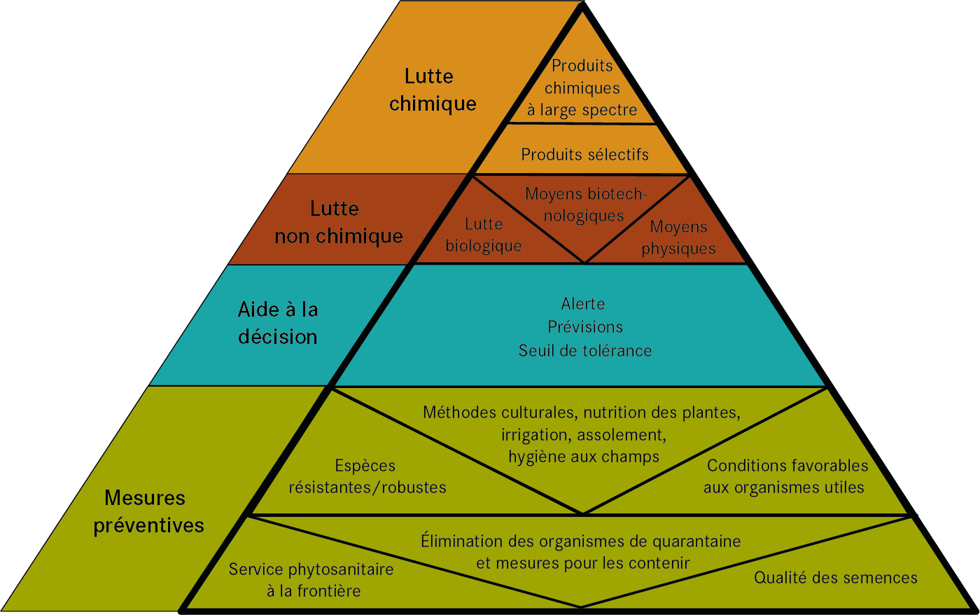 En ce qui concerne les maladies et les organismes nuisibles, l’approche de lutte intégrée existe depuis plusieurs décennies. Des mesures préventives et une prise en compte de différents instruments de décision forment la base de ce projet. Ce n’est qu’ensuite qu’interviennent les mesures de lutte directe, qui peuvent être soit biologiques, soit physiques, soit, en dernier recours, chimiques. La protection intégrée des plantes permet de lutter de manière préventive contre le développement de résistances, dont le risque augmente aussi en raison du réchauffement planétaire et, partant, de la prolifération grandissante de ravageurs.